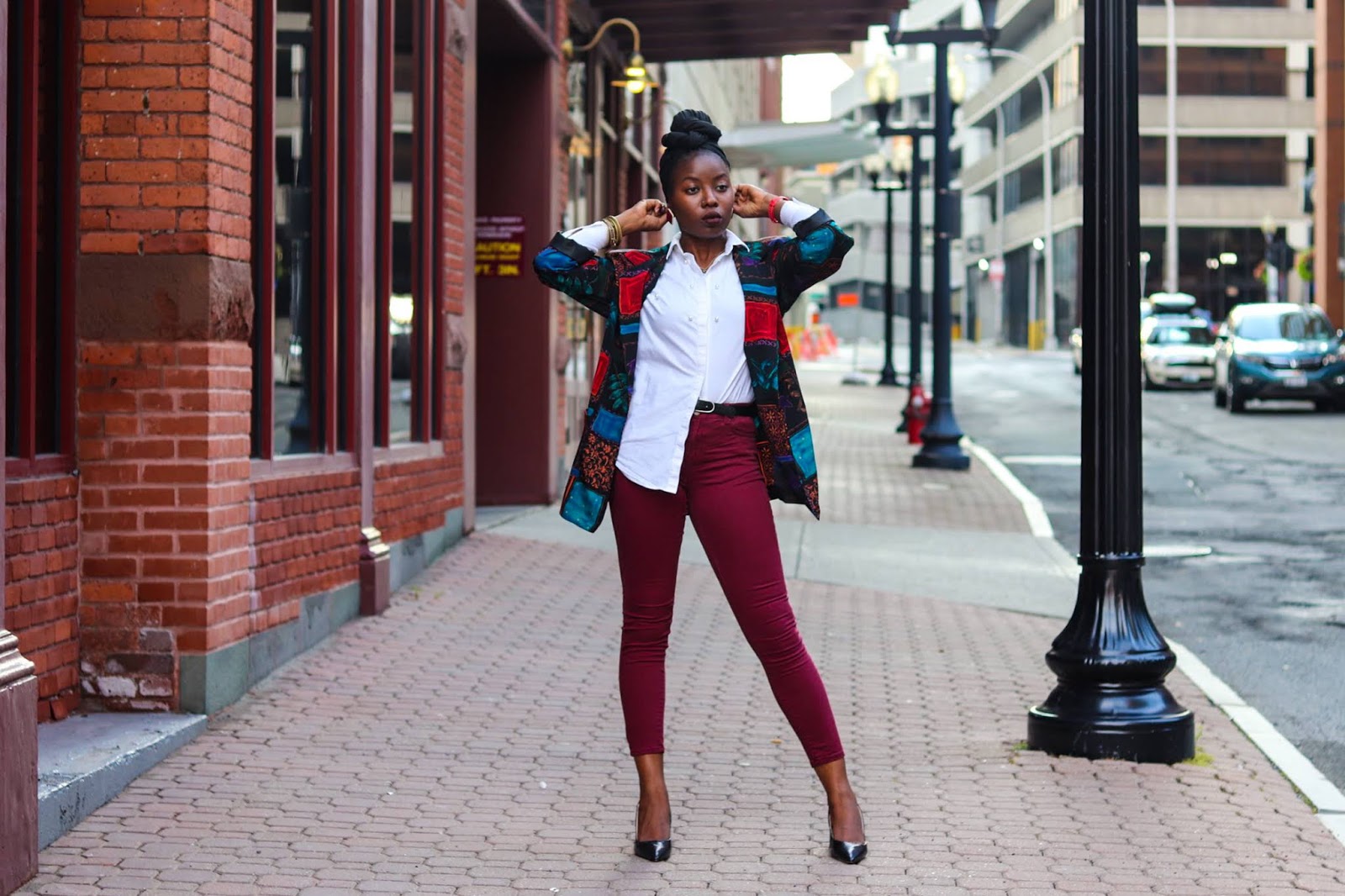 Maximize It: Create a more polished jean look by adding a white button-up and heels. I’m not supposed to wear jeans to work, but the blazer, button-up, burgundy color and heels perfectly disguised my jeans as pants. Hehehe, sticking it to the man.